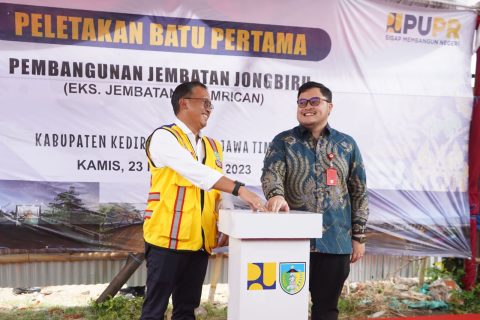 FOTO : Bupati Kediri Hanindhito Himawan Pramana saat groundbreaking atau peletakan batu pertama pembangunan jembatan Jongbiru.(dok) KEDIRI | Pembangunan Jembatan Jongbiru, Kecamatan Gampengrejo telah dimulai. Pembangunan jembatan penghubung antara Kabupaten