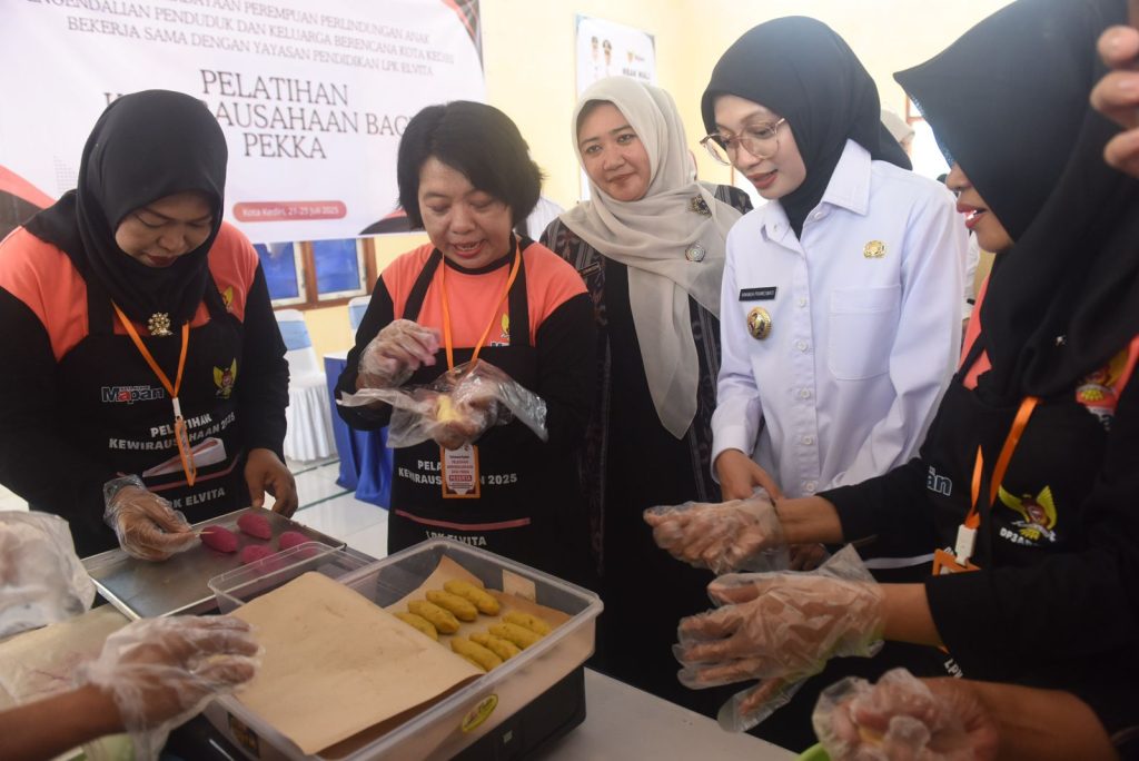 Kota Kediri-Wali Kota Kediri Vinanda Prameswati bersama Ketua TP PKK Kota Kediri Faiqoh Azizah Muhammad meninjau langsung kegiatan Pelatihan Kewirausahaan yang digelar di Balai RW Kelurahan Banjarmlati, Rabu (23/7/2025). Pelatihan ini diikuti oleh 46 orang yang merupakan para perempuan kepala keluarga (PEKKA) di tiap kelurahan di Kota Kediri.